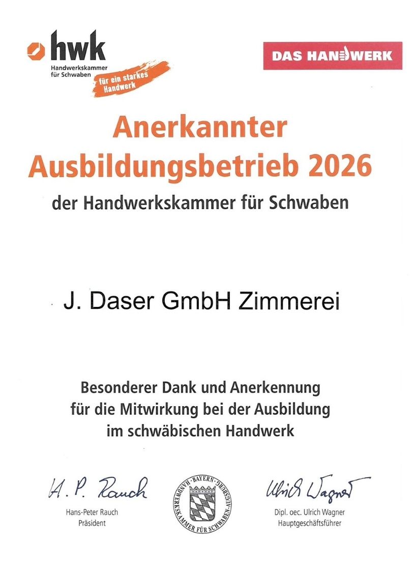Die Zimmerei wurde 2002 von Johannes Daser in erster Generation gegründet. Das Team setzt sich aus engagierten Fachkräften, Zimmermeistern mit Zusatzqualifikationen sowie Bautechnikern zusammen, die sämtliche Holzarbeiten für unterschiedlichste Bauvorhaben professionell umsetzen.